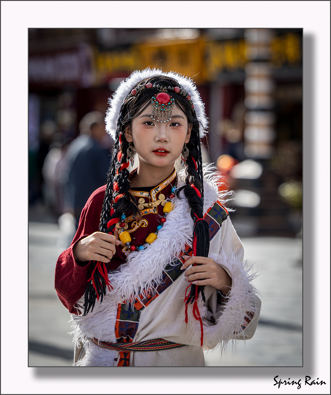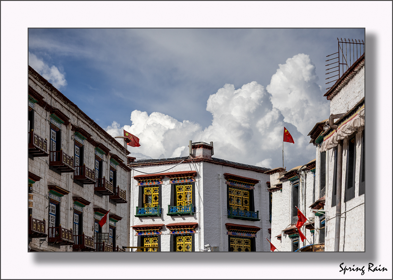 깃발 펄럭이는 상점들 사이에서 티벳인·한족·네팔인·인도인 상인들이 섞여 장사하는 풍경이 멋지다.